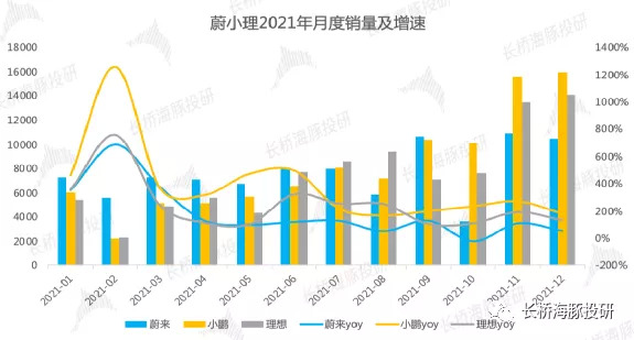 哪吒汽车2021年年初1月份销量略超2000辆,年终11-12月份均跻身月销万辆的阵营(12月销量是1月销量的4.6倍);
