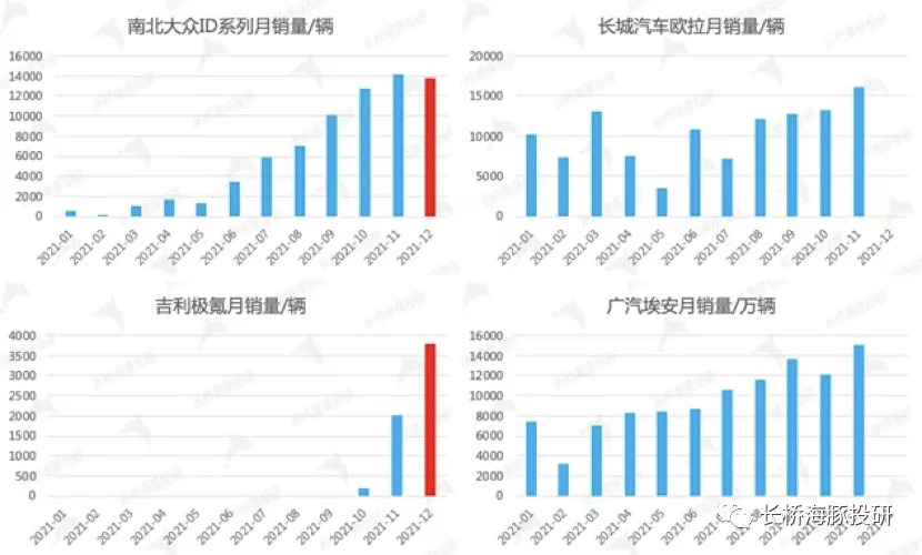 四个样本车企的月销量整体呈现攀升的趋势,其中南北大众ID系列、长城欧拉、广汽埃安月销量基本稳定在1万-1.5万辆之间;