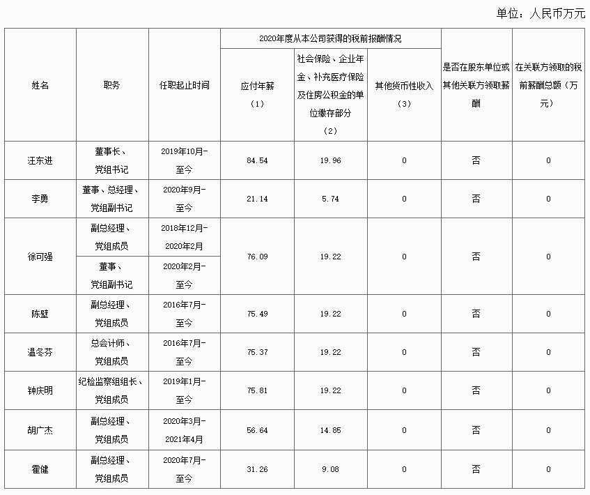 其中,中海油董事长、党组书记汪东进的2020年应付年薪为84.54万元,位列“三桶油”董事长年薪榜首。