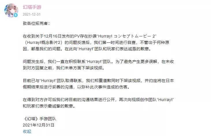 12月31日,《幻塔》官方发布声明,就12月16日公测时所发布的PV抄袭“Hurray! コンセプトムービー 2”(Hurray!概念影片2)致歉。这已经是《幻塔》第二次发布类似的公告了。
