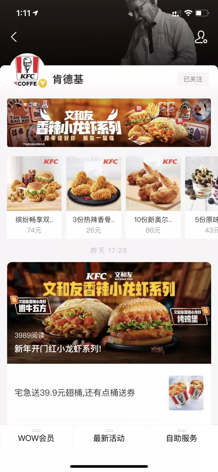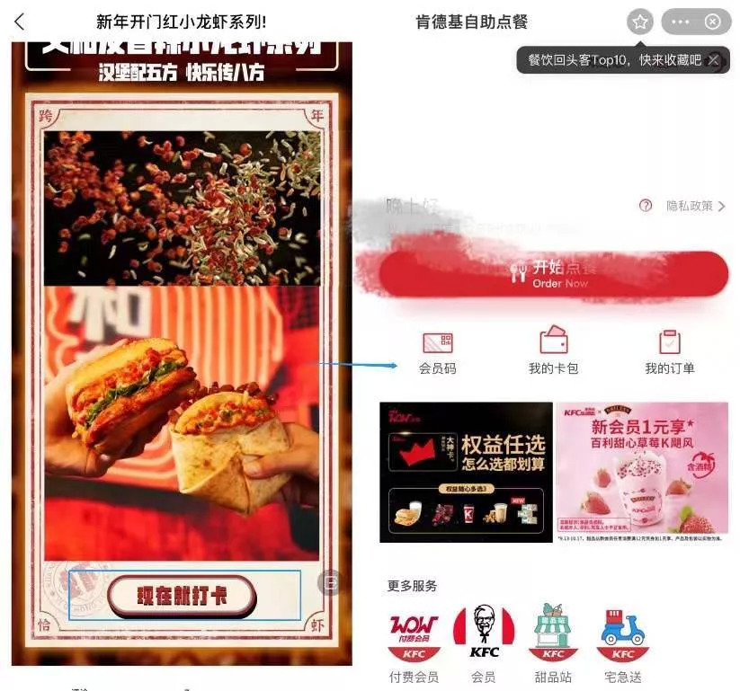 以KFC商户为例,在12月27日发布的“新年开门红小龙虾系列”图文内容里,用户可以直接点击跳转至肯德基自助点餐小程序里下单购买。此外,在肯德基服务号的首页,有直接的优惠券窗口,用户点击也可以直接跳转至相关小程序领取。