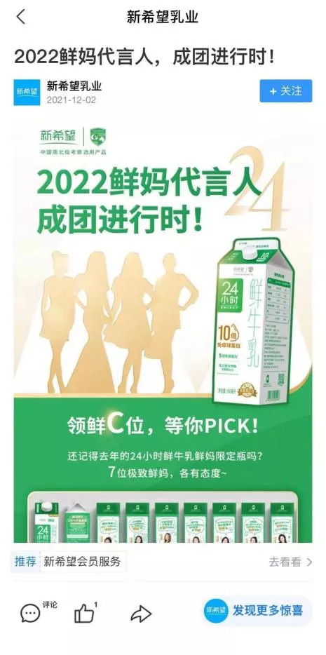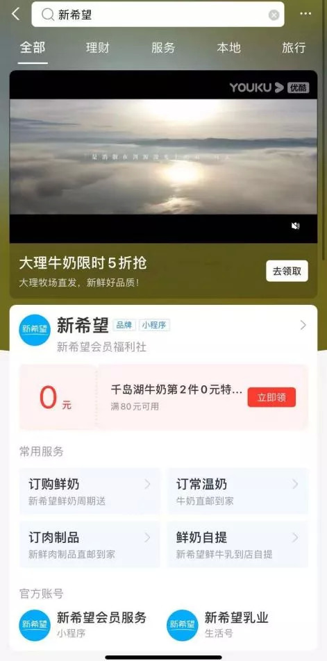 以企业新希望为例,用户通过支付宝搜索“新希望”时,会出现小程序“新希望会员服务”及生活号“新希望乳业”。用户可以直接进小程序购买相关产品,也可以看生活号的宣传内容,看看有什么新品或者折扣活动上市。