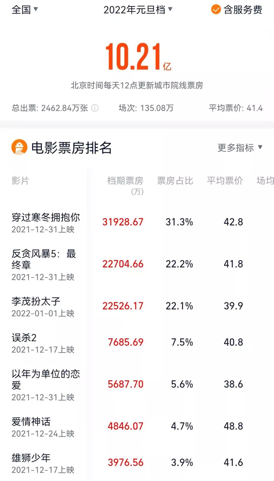 元旦档(1月1日-3日)上映的新片中,豆瓣只有6分的《穿过寒冬拥抱你》已经评分最高的了。像《反贪风暴5》、《李茂换太子》和《以年为单位的恋爱》,都只在5分左右徘徊。