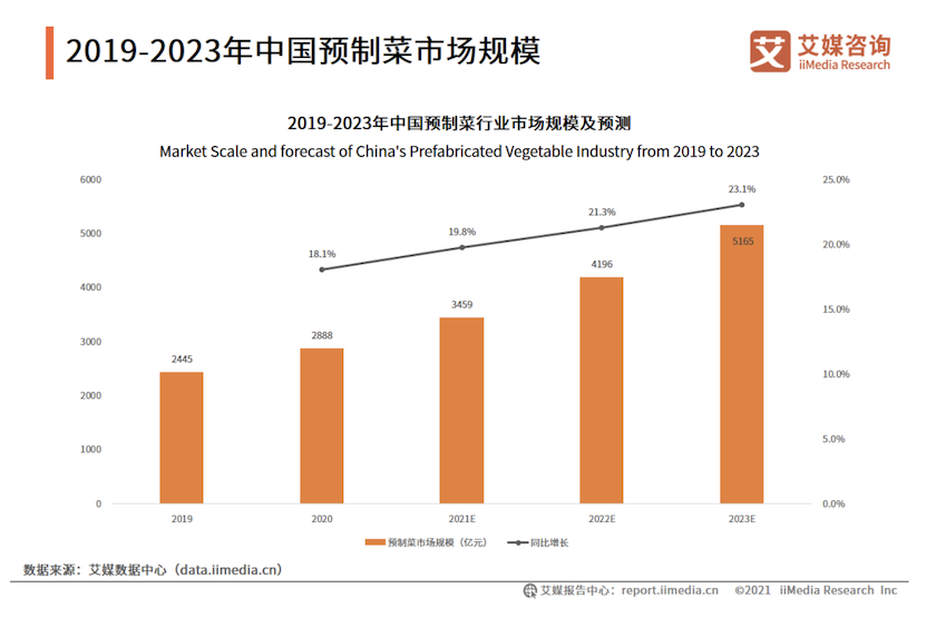 多家咨询机构或研究院看好预制菜未来表现。iiMedia Research(艾媒咨询)数据显示,2021年中国预制菜市场规模预估为3459亿元。随着消费升级以及冷链物流布局,预制菜市场将向B、C端同时加速发展,之后将以20%的增长率逐年上升,2023年中国预制菜规模约为5165亿元。