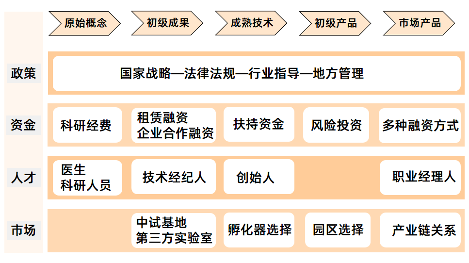 为此,动脉橙果局绘制了一张医学产学研用的流程图,该图将医学科研成果转化过程中大致分成了提出原始概念、出现初级成果、拥有成熟技术、实现初级产品、达到市场化产品五个阶段,并从政策、资金、人才、市场四个维度标注了每个阶段会涉及的一些问题,并从中选出“政策的把握”“概念验证和中试生产”“融资方式选择”“科研价值与市场价值”“专利的保障和激励”五个热点话题进行讨论分析。