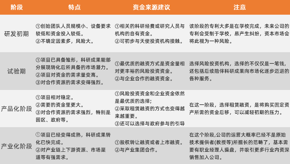 因此,这一时期需要的是对回报周期要求不急迫、额度较小、能及时补充,并能承担相对较高风险的资金。所以,研发期较为合适的融资方式为相关的科研经费或研究人员与机构的自有资金。