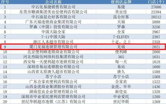 虽然对于外省人而言,见福名不见经传。但从全国门店数来看,当前的见福已涌入全国连锁便利店品牌前十名,门店总数超过2021家,仅次于7-11的2387家门店。