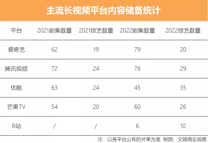 总体来看,优爱腾芒四大视频平台的2022片单上共计有372个项目,其中剧集262部、综艺110档,数量较去年皆呈现上升。