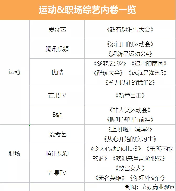 上述两大类别外,视频网站今年在运动、职场这两大赛道也出现了扎堆现象。