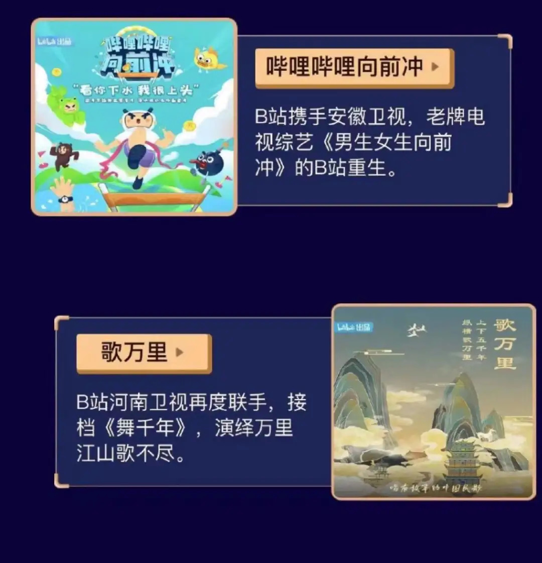 另一边,B站将在今年继续牵手河南卫视推出新的国风综艺《歌万里》,与安徽卫视合力推进老牌电视综艺《男生女生向前冲》的网络重生,打造《哔哩哔哩向前冲》。