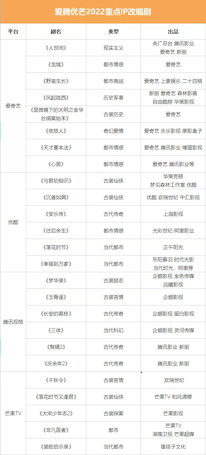 那么,以爱腾优芒为代表的视频网站究竟会在2022下出一盘怎样的大棋?背后藏着哪些细节的调整?B站又会在其中制造多少变化?我们将从内容与制作两个层面去窥探答案,而本篇文章会先从剧集与综艺这两大支柱性内容切入。