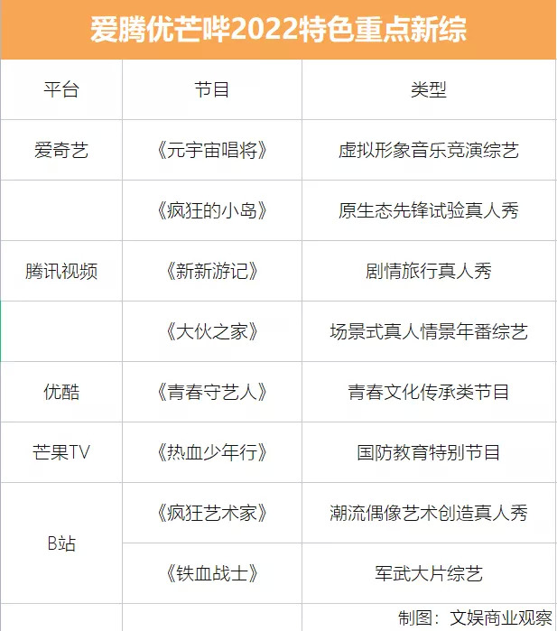 爱奇艺瞄准元宇宙风口和野外生存挑战分别筹备了《元宇宙唱将》《疯狂的小岛》;腾讯视频S+级新综《新新游记》为“中国版《新西游记》”,《大伙之家》为市场空白的年番网综;优酷《青春守艺人》侧重呈现跨界融合表达传统文化;芒果TV《热血少年行》主打沉浸式军事生存,为“海军陆战队版《真正的男子汉》”;B站《疯狂艺术家》《铁血战士》分别聚焦Z世代年轻艺术家和退伍特种兵。