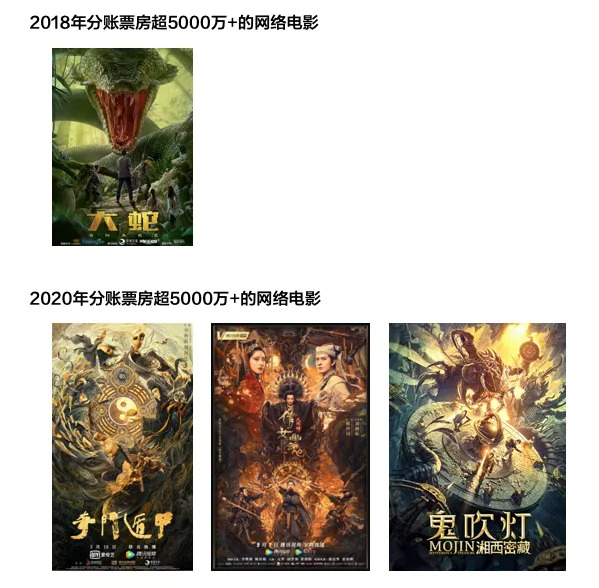 就在大家疑惑于《大蛇》的分账天花板为何在2019年难以突破时,2020年就先后出现了《奇门遁甲》《倩女幽魂:人间情》《鬼吹灯之湘西密藏》三部5000万+网络电影,网络电影“分账破亿近在迟尺”的声音也开始出现——但2021年5000万+头部爆款缺席、破千万数量下滑的现象却说明,网络电影的发展并没有那么气势如虹,反而进入了类似于2019年的又一“沉淀期”。
