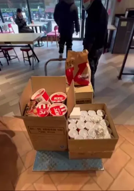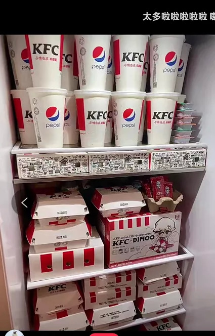 这种整盒购买的情况,被称为“连盒端”。多数潮玩玩家,为了集齐一整套,都会选择连买6份。于是,不少网友实现了“肯德基自由”,有人分享了自家冰箱被肯德基塞满的场景,有人拎着18杯可乐被保安当成了外卖小哥,有玩家则晒出用推车采购的图片……