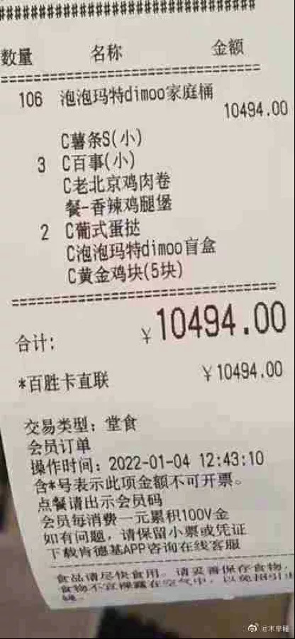 不过,这些都还只是普通玩家,一张流传更广的票据显示,一位“王者玩家”一次性花费10494元购买了106份套餐。根据一份套餐中有三杯小可乐计算,光可乐就足够这位买家喝一年了。