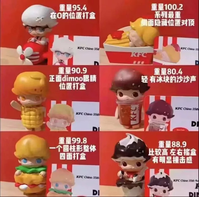 “可乐款重量80.4g,轻,有冰块的沙沙声;飞机款重量95.4g,在0的位置打盒”。率先抢到玩偶的玩家,根据产品特点和重量,将辨娃的思路作出总结发在了社交平台上。