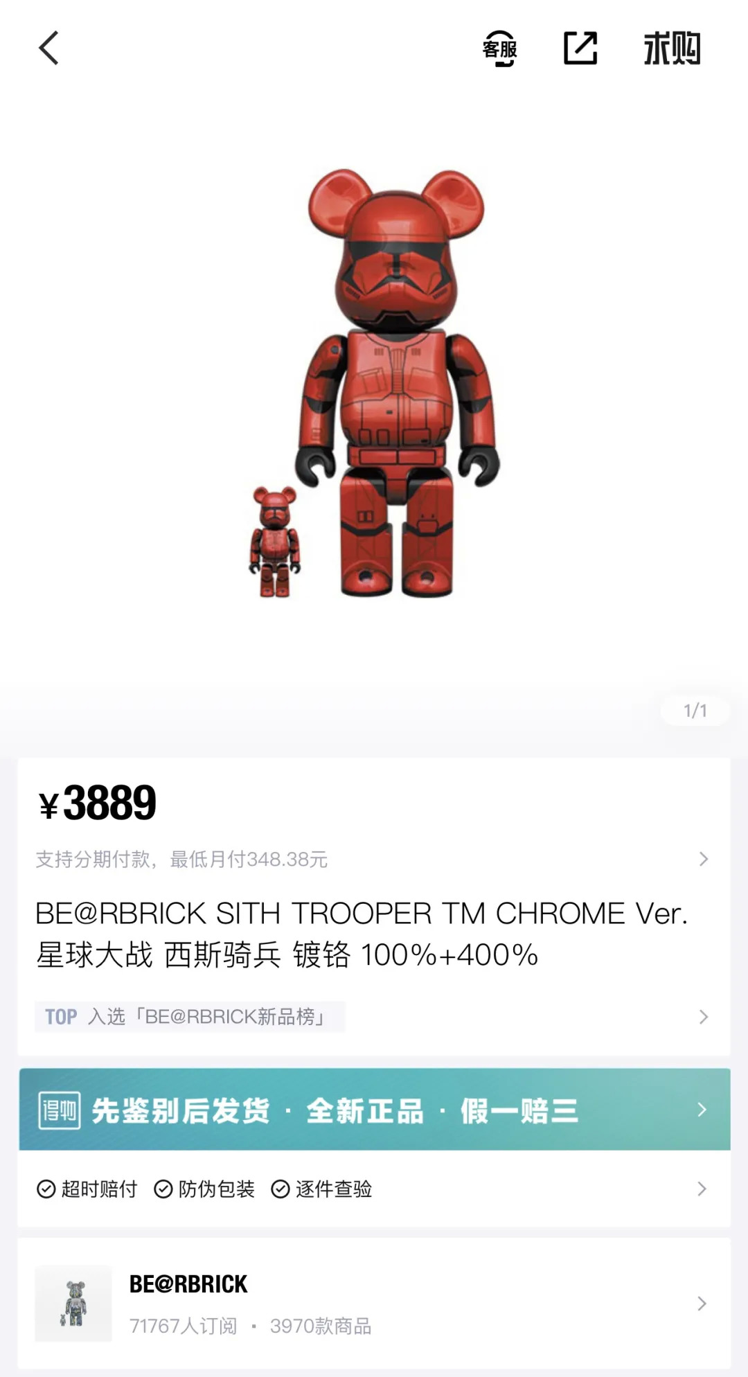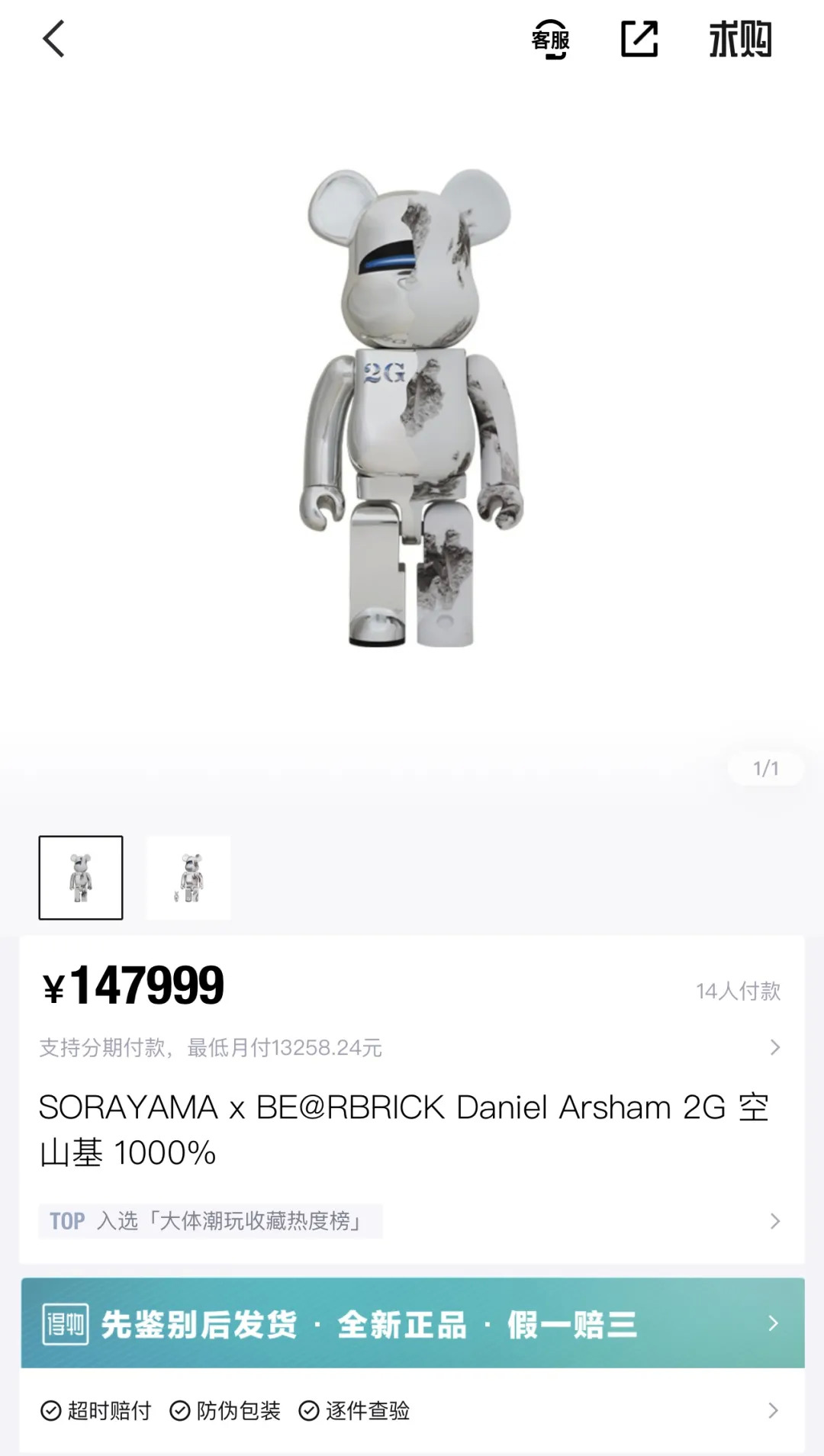 根据尺寸不同,积木熊的官方售价一般在几十元到几千元之间。但在某鉴定交易平台上,几乎没有积木熊按照原价出售。最贵的一款“SORAYAMA X BE@BRICK Daniel Arsham 2G 空山基 1000%”售价147 999,但其发售价仅有8 800。而去年12月刚发售的“星球大战西斯骑兵镀铬100%+400%”发售价仅1 000人民币左右,该交易平台已经要价3 889。