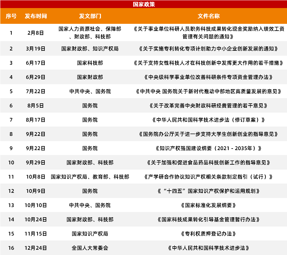 尤其是在近一两年,随着创新进程的逐步加快,大量相关政策呼之欲出。据统计,2021年,我国在科研成果转化领域共出台49条政策,其中国家政策16条,地方政策33条,其核心内容主要聚焦于“知识产权、人才培养、科研激励”三个焦点板块。