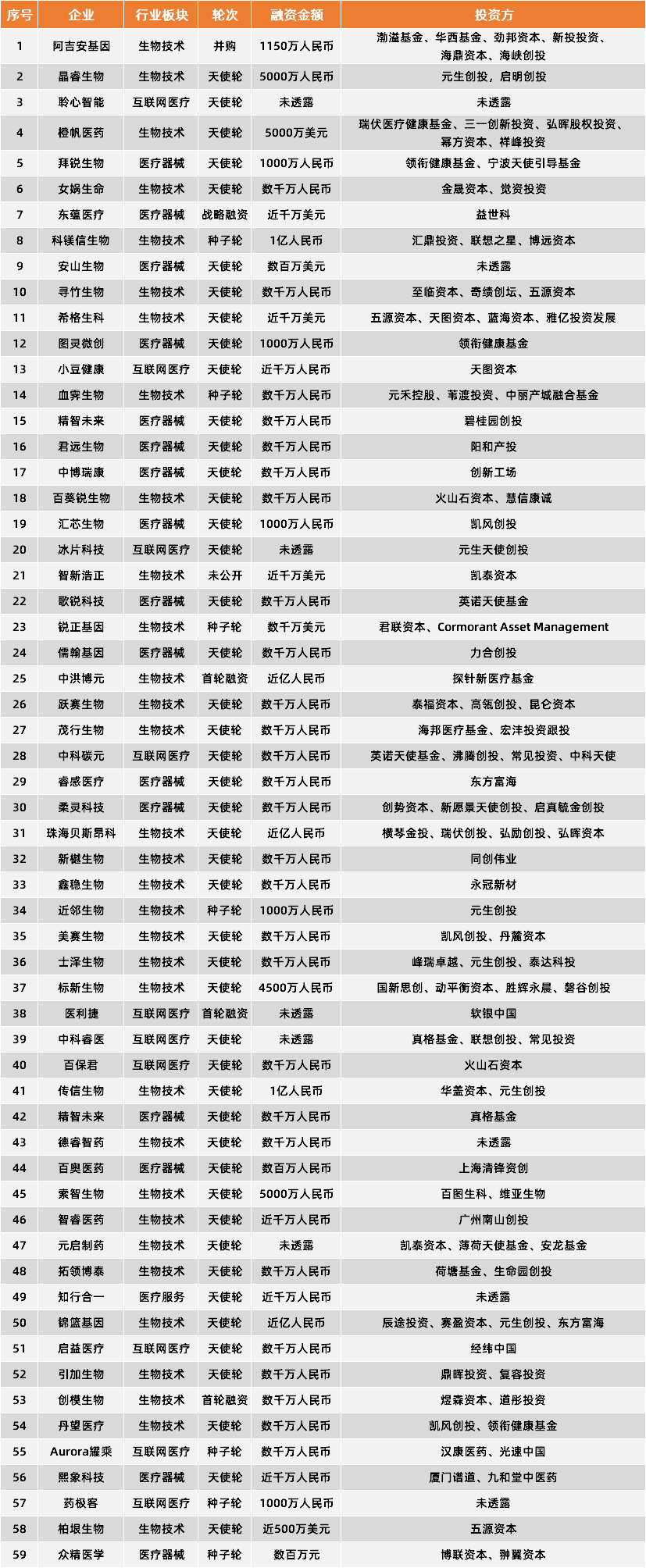 二是早期项目更专注解决当下需求。通过进一步分析发现,59家初创企业主要聚焦于癌症、新冠、生殖等当前处于重度需求的医疗细分领域。