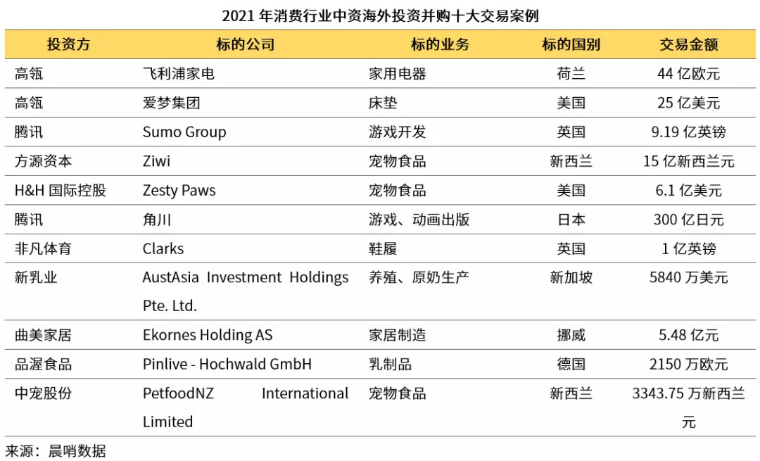 在全球遭受疫情冲击的第二年,国内消费行业投资出现了罕见的火热态势(不过又马上熄灭)。与此形成对比的是,消费领域里中资海外投资并购似乎变少了。并且,前几年动辄十数亿出海收购奢侈时尚品牌的情况,也似乎一去不复返了,取而代之的是游戏和宠物食品。