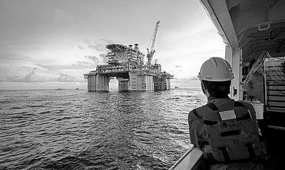 工作人员在拖轮上凝望“深海一号”能源站。 资料图片