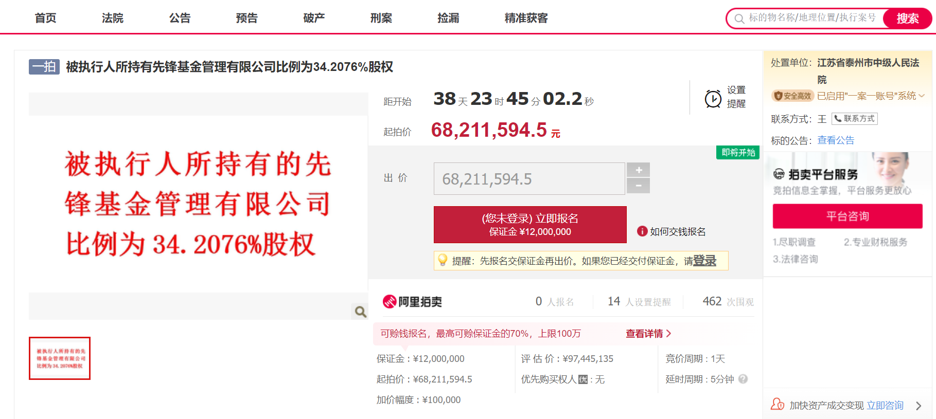 就在1月4日,阿里拍卖平台的一则拍卖信息显示,先锋基金34.21%的股权将于2月14日进行第一次拍卖。
