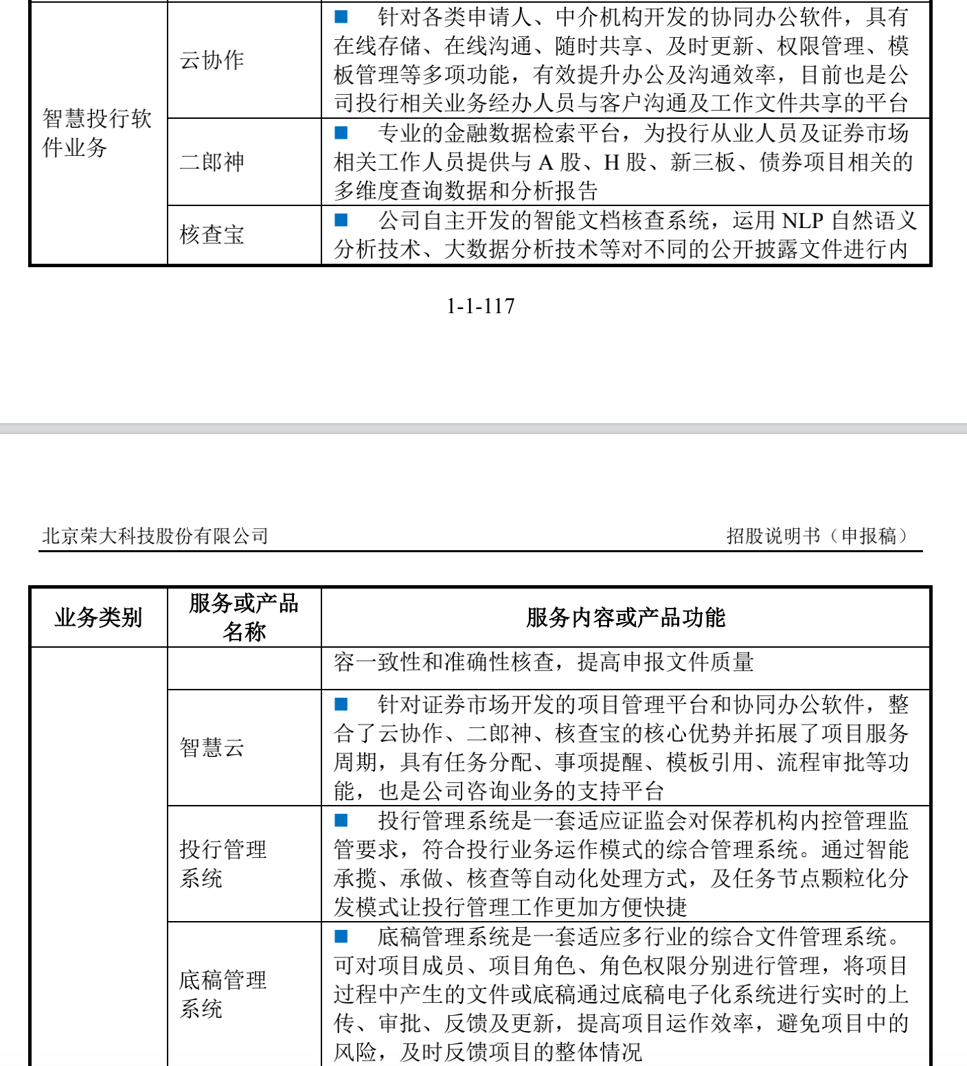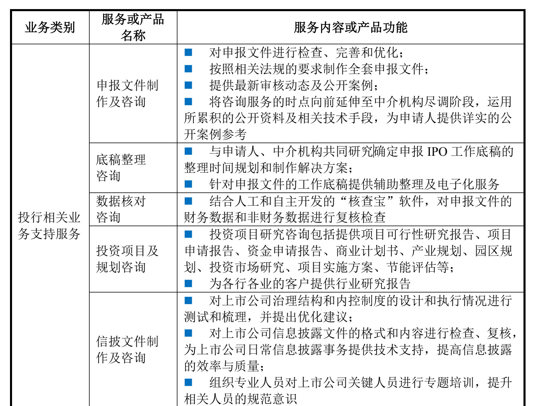 在申报文件制作及咨询方面,北京荣大将“咨询服务的时点向前延伸至中介机构尽调阶段”作为服务内容,并把“针对申报文件的内容进行实质性检查”作为该业务的增值服务。