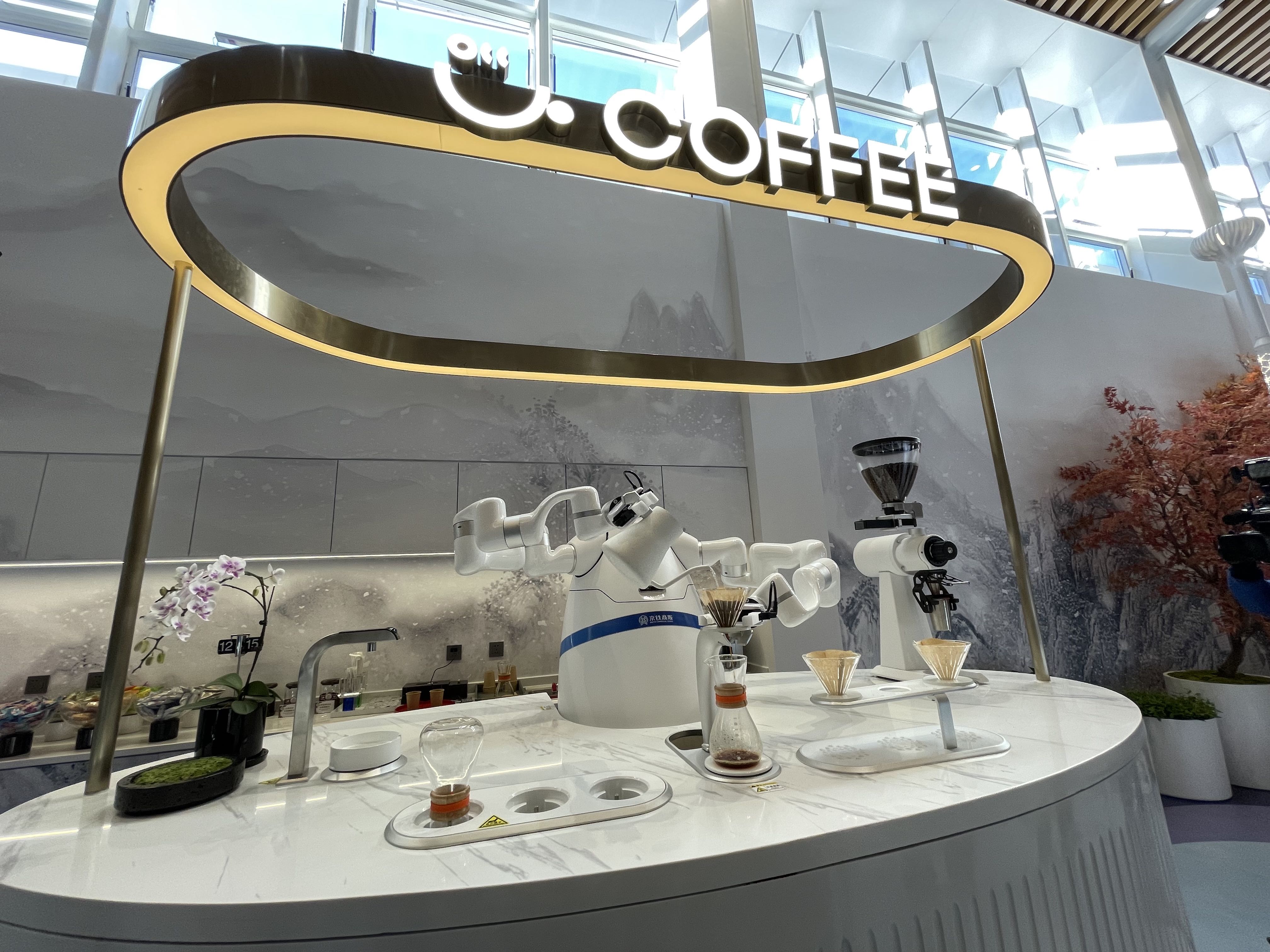 据服务中心的相关工作人员介绍,这里主要为闭环人员服务,每天有消毒机器人消毒工作,还有机器人制作手冲咖啡。