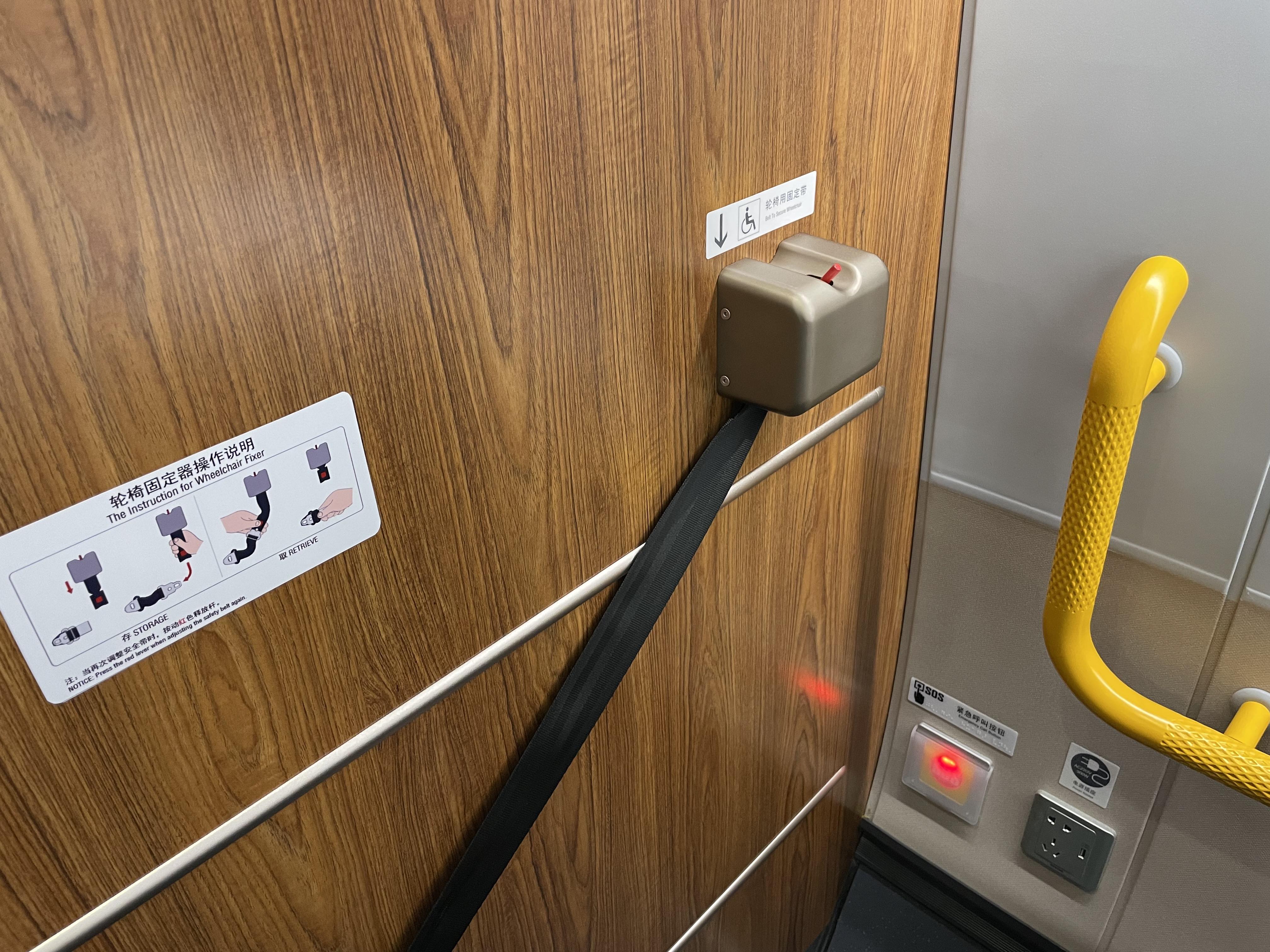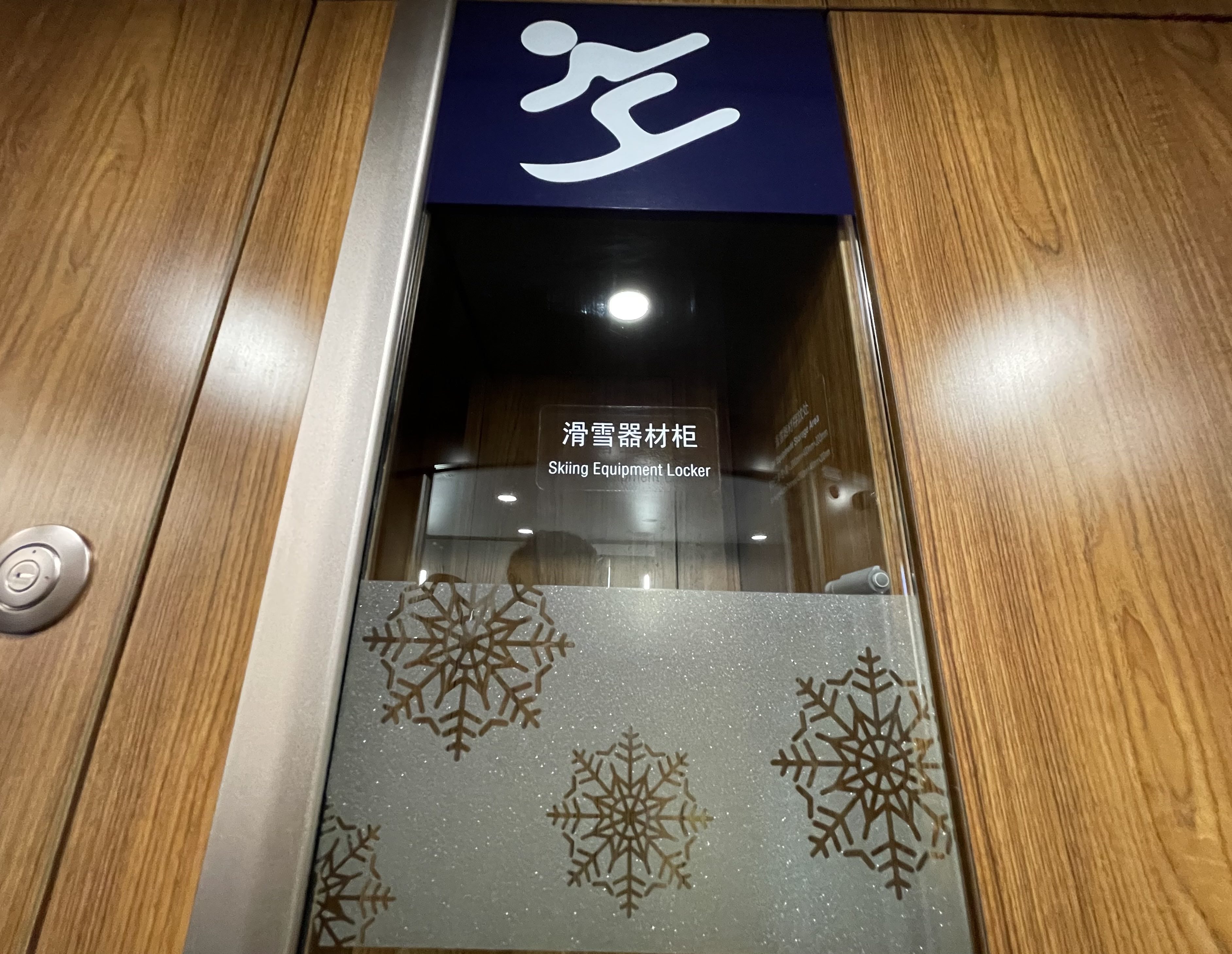 另外,动车组1、4、8号车厢二位端均设有滑雪器材存放柜,供滑雪爱好者存放滑雪板等器材,并设有滑雪器材锁,保证存放安全;4号车厢还设置了轮椅存放区、无障碍卫生间及站台补偿器,便于轮椅无障碍存放和通过,适应冬残奥会需要。