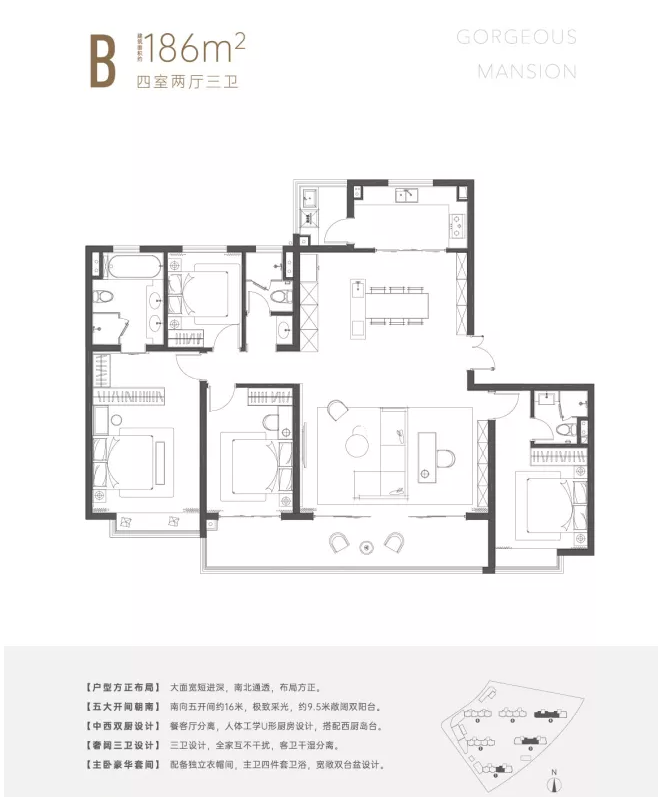 项目共计三种产品户型,分别是建面约143、186、189㎡,全部四房起步,其中189㎡为边户带转角设计,占比不到90套。