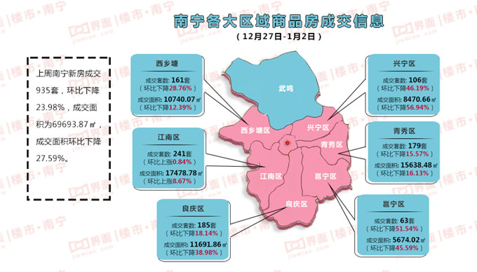 上周(2021年12月27日-2022年月2日)南宁新房成交935套,环比下降23.98%,成交面积为69693.87㎡,成交面积环比下降27.59%。