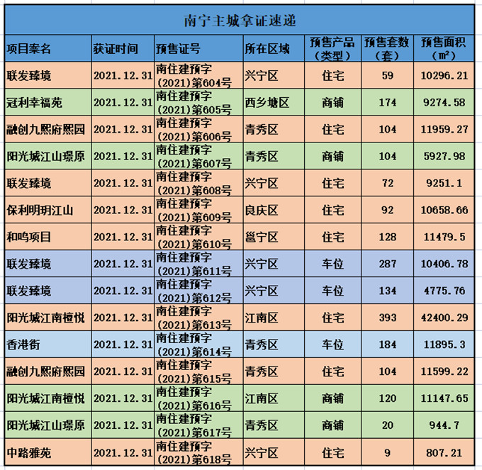 从拿证情况来看,2021年12月31日,据南宁市住房和城乡建设局网站发布商品房预售公告,南宁共有10个项目获得15张预售证,分别为联发臻境、中路雅苑、阳光城江山璟原、阳光城江南檀悦、融创九熙府熙园、香港街、保利明玥江山、和鸣项目、冠利幸福苑等楼盘取得预售许可证,产品涵盖了商业、高层、小高层、洋房等类型。