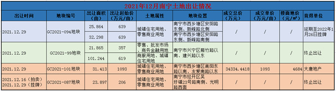 2021年12月29日,位于南宁市经开区吴圩镇23.897亩的GC2021-087地块终止出让,出让起始价206万元/亩。据了解,该地2021年12年16日拍卖,转为2021年12月29日挂牌,因无竞拍而终止出让。