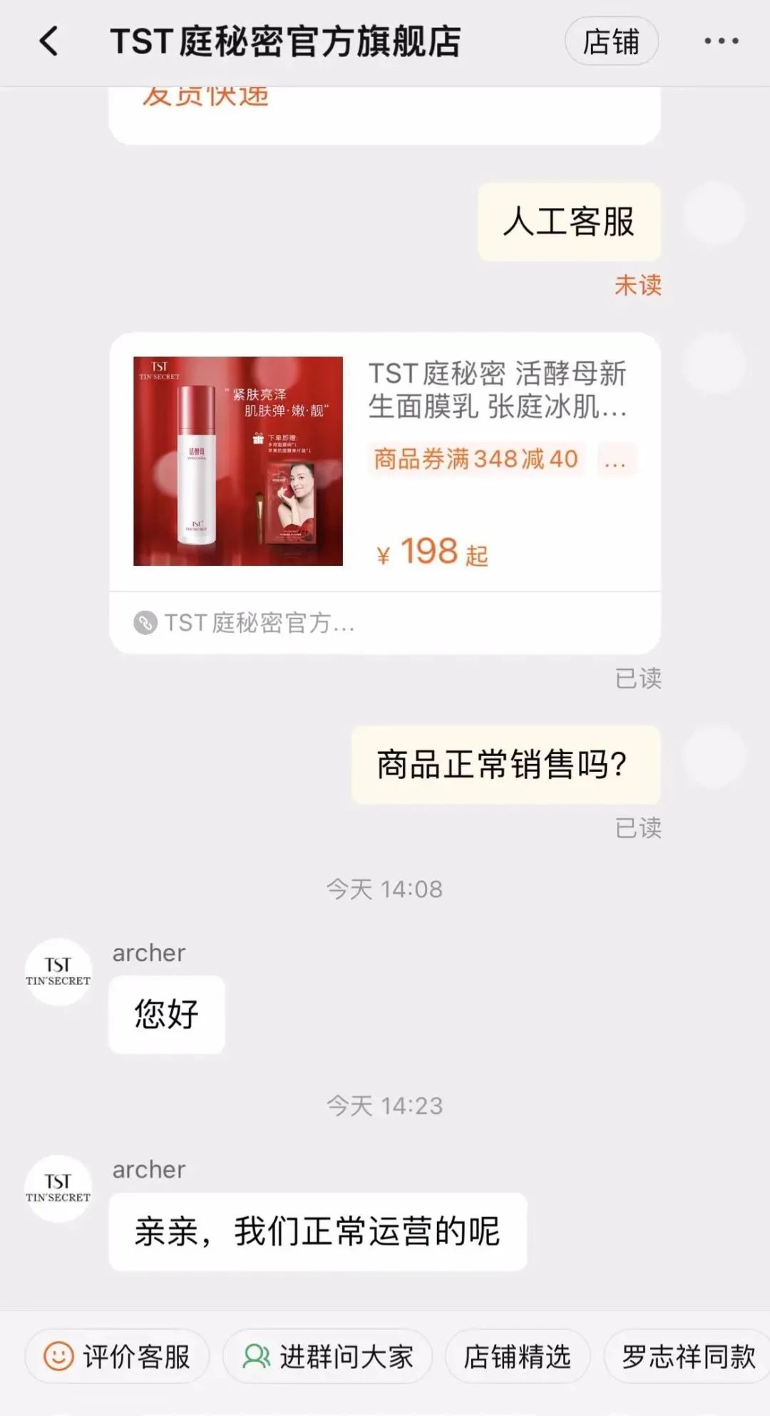 线下办公如常,线上又如何呢?记者分别打开“TST庭秘密”App和淘宝TST庭秘密官方旗舰店,均属于正常运营状态,在上新栏里还有即将开售的产品预告。记者联系店铺客服想询问商品销售情况,一天后才得到“正常运营”的回复。