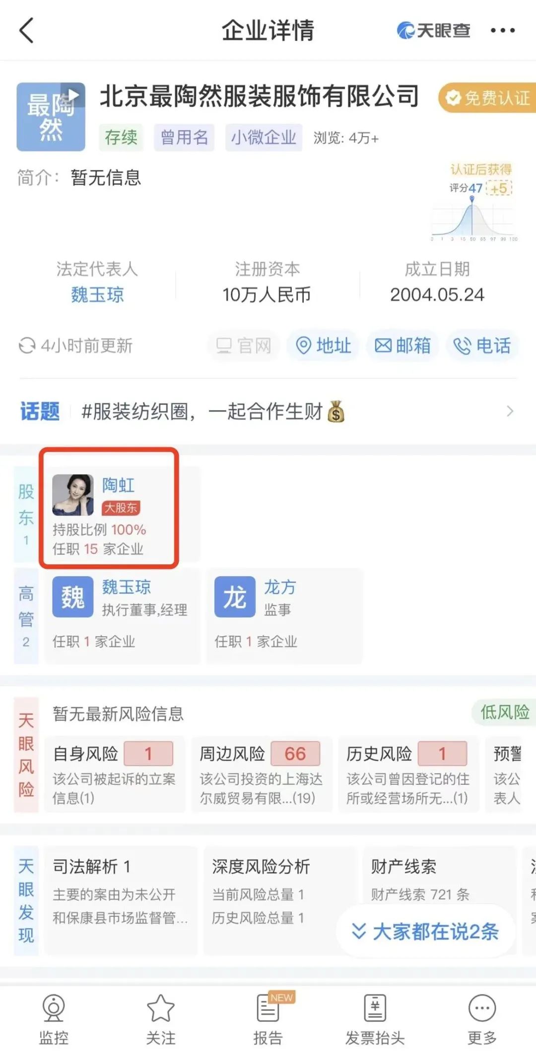 天眼查App显示,陶虹作为达尔威股东,直接持股比例为1.93%,同时通过北京最陶然服装服饰有限公司间接持股4.7%,而该公司由陶虹100%持股,最终陶虹在达尔威公司的受益股份约达6.64%。在TST的老板席位中,陶虹也显示为董事。
