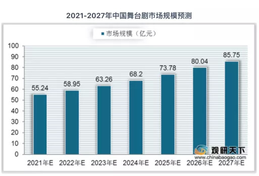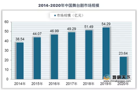 据观研天下数据显示,我国舞台剧行业市场规模从2014年到2019年逐年增长,从38.54亿元增长至54.29亿元,复合年增长率为7.09%;2020年同比下降56.46%,仅为23.64亿元。根据该机构预测,2021年中国舞台剧市场将增至55.24亿元。