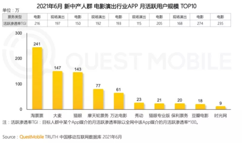 另一方面,2021年的演出行业需求端发力明显。根据Quest Mobile数据显示,在2021年6月新中产人群电影演出行业APP月活跃用户数中,现场演出活跃渗透率为197万,仅次于电影216万。