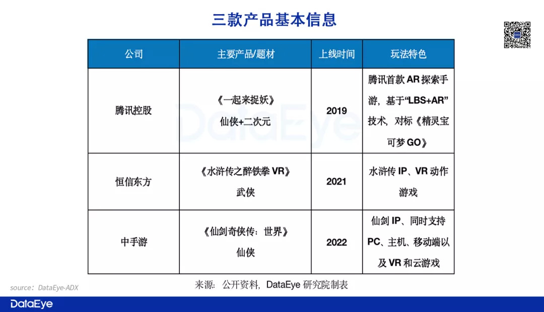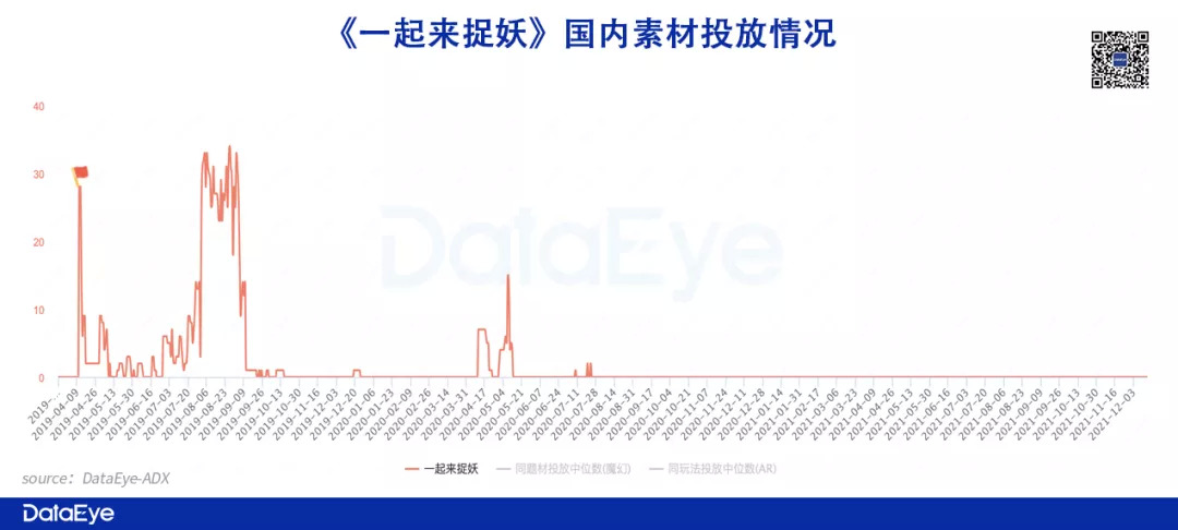 《一起来捉妖》:腾讯首款AR探索手游,“试水之作”。2019年4月公测。游戏基于“LBS+AR”技术,对标《精灵宝可梦GO》,以“捉妖”为核心玩法。玩家可以通过AR功能抓捕身边的妖灵,对它们进行培养,完成游戏中PVE/PVP对战、展示、交易等功能。根据DataEye-ADX数据,该游戏2019年上线前后少量投放买量素材后,再未大力投放。可见仅为腾讯对标《精灵宝可梦GO》的“试水之作”。