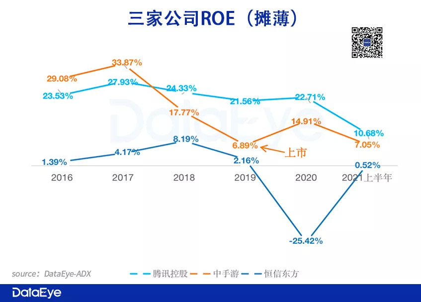 2021年上半年,中手游营业总收入同比增长27.2%,归母净利润同比增长36.8%,同样亮眼。上半年,中手游ROE(摊薄)为7.05%,全年有望与2020年持平,经营稳定性不亚于腾讯。(2019年中手游ROE大跌,主要因为上市导致总资产膨胀,拉低资产周转率,这是所有上市公司都会经历的,对公司经营无影响,排除这一因素,中手游当年ROE预计在14%—17%水平)。