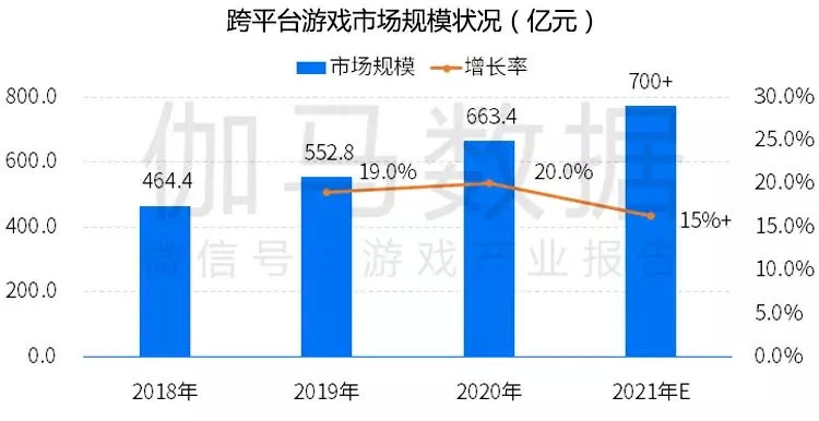 根据伽马数据近期发布的《2021 中国游戏创新品类发展报告——跨平台游戏》显示,中国跨平台游戏市场规模逐年扩大,2020 年市场规模已增至 663.4亿元,同比增长20%,而2021年市场规模有望突破700亿元,同比增长15%+。