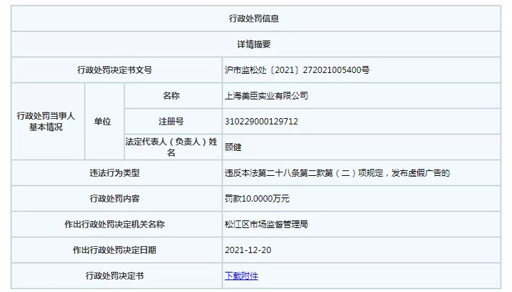 据上海市市场监管局行政处罚信息内容显示,2021年9月30日,监管局接到举报称,美臣实业有发布违法广告的嫌疑,因此对其进行立案调查。经查明发现,美臣实业销售总监“龙某”有在朋友圈发布虚假广告的事实,最终公司被处以罚款10万元。