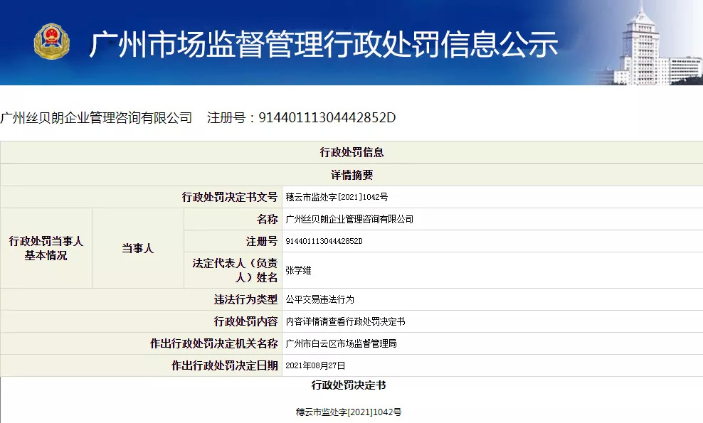 在去年8月,广州丝贝朗企业管理咨询有限公司也因为在向直营店和授权店的店长和店员以及向有意向开授权店的顾客进行培训过程中,化妆品培训课件存在虚假宣传的情况,被处以29万元的罚款。