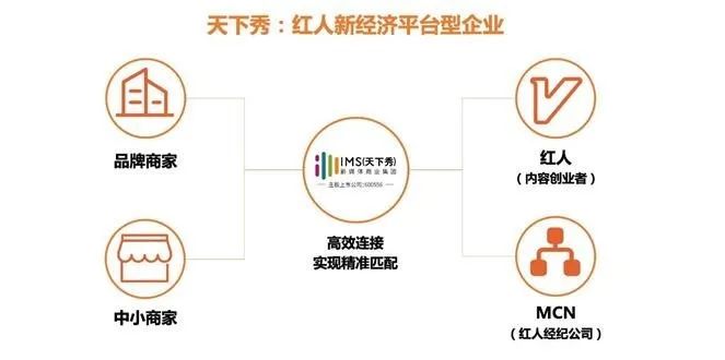 天下秀是一家立足于红人新经济领域的平台型企业,核心服务红人(内容创业者)、MCN(红人经纪公司)、品牌商家、中小商家,致力于用技术驱动去中心化的红人新经济的新型基础设施建设。天下秀主营业务为红人营销平台服务,通过搭建WEIQ平台,以大数据技术向红人与企业提供在线红人营销服务的撮合与交易平台。