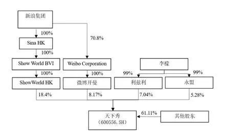 2018年末,天下秀受让瑞莱嘉誉持有的ST慧球股份4604万股(占总股本的11.66%)股权转让作价57,000万元。随后在2019年末,ST慧球向天下秀全体股东发行约13.32亿股股份购买天下秀100%股权,并对天下秀进行吸收合并。交易完成后,ST慧球控股股东变更为Show World HK,持股比例为18.4%;新浪集团和李檬作为ST慧球实控人,共同控制ST慧球38.89%股份;证券名称由ST慧球更改为天下秀。
