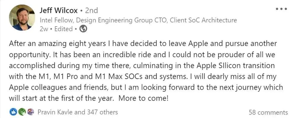 芯东西1月7日消息,苹果M1芯片设计总监杰夫·威尔科克斯(Jeff Wilcox)本周宣布,他已离开苹果,前往英特尔担任新职务。