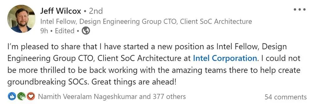 2021年1月,威尔科克斯已成为英特尔院士、设计工程部CTO(首席技术官),将负责所有英特尔客户端的SoC架构。