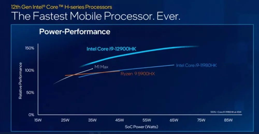 ▲英特尔公布的12900HK与AMD、苹果顶级处理器在功耗性能方面的对比图