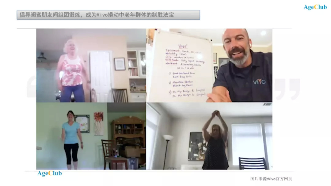 例如老人在进行热身时,教练便会让线上的老年用户进行首字母造词或有趣知识问答,“用户边单脚站立边说出以‘A’字母开头的单词时,整个课堂的氛围都会更轻松更有趣,而身体大脑同时锻炼的双任务形式,也让一些有轻度认知障碍的客户变成了Vivo的忠实粉丝”。