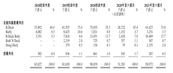 抛开基本面来看,德盈控股与泡泡玛特实际上都面临着一个相同的问题:过度依赖同一IP。正如泡泡玛特离不开Molly,德盈控股和小黄鸭之间的联系也在这几年里变得愈发紧密。从招股书来看,B.Duck在2018-2020年里为德盈控股带来的收入分别为5389.2万港元、6155.5万港元和7503.5万港元,占总体角色授权收入比重分别为84.4%、75.4%和76.5%。