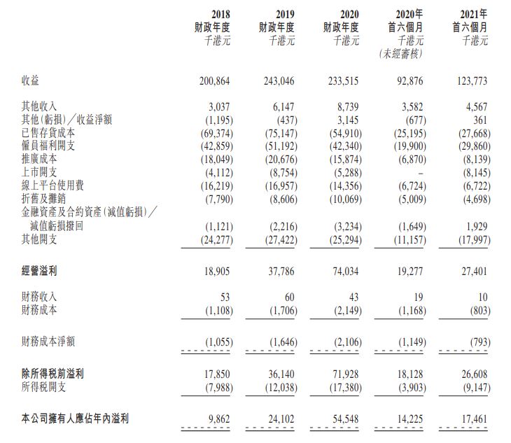 根据泡泡玛特近年来的财报数据,其2018-2020年的营收数据分别为人民币5.15亿元(约合6.3亿港元)、16.83亿元(约合20.6亿港元)和25.13亿元(约合30.75亿港元);净利润分别为人民币9952万元(约合1.22亿港元)、4.51亿元(约合5.52亿港元)和5.23亿元(约合6.4亿港元)。2021年上半年,这两项数据分别为17.72亿元(约合21.69亿港元)和3.59亿元(约合4.39亿港元)。可以看出,德盈控股和泡泡玛特间还有不小差距。